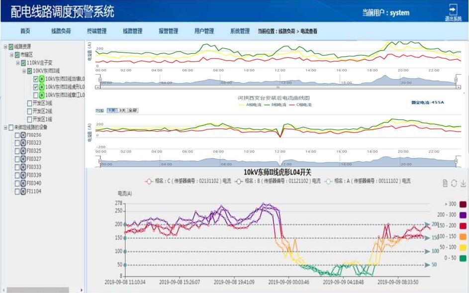 導(dǎo)線負(fù)荷溫升監(jiān)測系統(tǒng)綜合運(yùn)用了太陽能取電、無線通信及信息網(wǎng)絡(luò)等現(xiàn)代科學(xué)新技術(shù)。能實時準(zhǔn)確地在線監(jiān)測線路狀態(tài),并將所采集到的負(fù)荷及溫度等信息發(fā)送回主站中心;主站對信息進(jìn)行數(shù)據(jù)統(tǒng)計、分析、拓?fù)溆嬎?,確定負(fù)荷溫升狀態(tài),從而引導(dǎo)工作人員定位隱患。為提高相關(guān)工作人員的效率、減輕勞動強(qiáng)度提供了一種強(qiáng)有力的手段;同時,溫度信息會通過短消息發(fā)送到供電局生產(chǎn)管理部門、線路專工、線路維護(hù)負(fù)責(zé)人等設(shè)定的相關(guān)人員的手機(jī)上,能有效提高線路故障檢測的自動化水平,及時為線路安全性能監(jiān)測提供科學(xué)有效的依據(jù),為電力的輸送及減人增效提供條件。