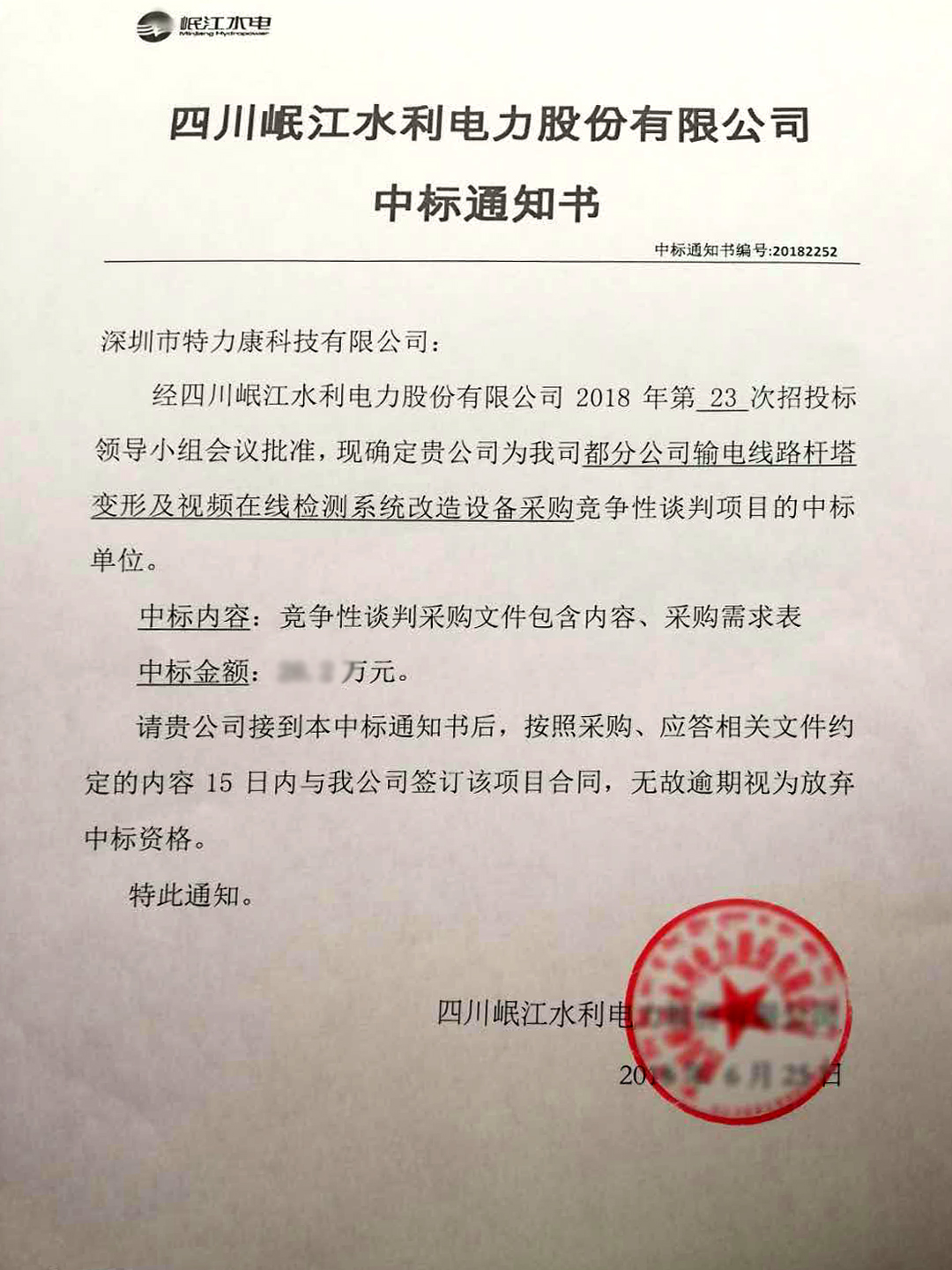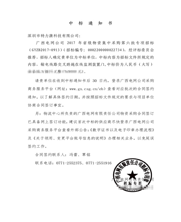 特力康中標(biāo)國網(wǎng)黑龍江送變電工程公司的2024年度第18次物資類競爭性談判采購項目——慶陽驅(qū)鳥器物資框 特力康中標(biāo)國網(wǎng)甘肅省電力公司省管產(chǎn)業(yè)單位2024年第五次物資競爭性談判授權(quán)采購項目 中標(biāo)喜訊:深圳市特力康科技有限公司成功入圍許繼集團(tuán)綜合能源公司輸電線路視頻在線監(jiān)測裝置模塊集采項目 中標(biāo)喜訊:特力康成功中標(biāo)國網(wǎng)重慶市電力公司渝中一片區(qū)項目 特力康成功中標(biāo)國網(wǎng)天津市電力公司2024年第二次?物?資招標(biāo)項目 特力康中標(biāo)國網(wǎng)安徽省電力有限公司蕪湖供電公司2024年3月非物質(zhì)采購項目 浙江電力裝上“氣象哨兵”:特力康裝置守護(hù)電網(wǎng)應(yīng)對臺風(fēng)暴雨 蜀道巡線不用“爬”:特力康視頻在線監(jiān)測裝置守護(hù)四川輸電鐵塔 風(fēng)雪中的 “防冰哨兵”:內(nèi)蒙古電力用特力康監(jiān)測系統(tǒng)筑牢覆冰防線 雙軸感知護(hù)塔穩(wěn):山西電力用特力康裝置破解采空區(qū)傾斜難題 江西電力裝上 “智能防鳥衛(wèi)士”—— 特力康綜合激光驅(qū)鳥器破解湖區(qū)變電站鳥害難題 破解巡檢難題:貴州電力用特力康 AI 微拍裝置,精準(zhǔn)捕捉線路隱性隱患 精準(zhǔn)捕捉 “微氣象”:浙江電力用特力康預(yù)警系統(tǒng)筑牢電網(wǎng)氣候防線 守護(hù) “電力咽喉”:湖南電力投用百套特力康三跨 4G 監(jiān)控球,筑牢安全防線 貴州電力裝特力康電網(wǎng)架空線路覆冰監(jiān)測系統(tǒng),精準(zhǔn)防冰保電網(wǎng)過冬? 寧夏配電線路安裝了我司防外破電子化智能警示牌
