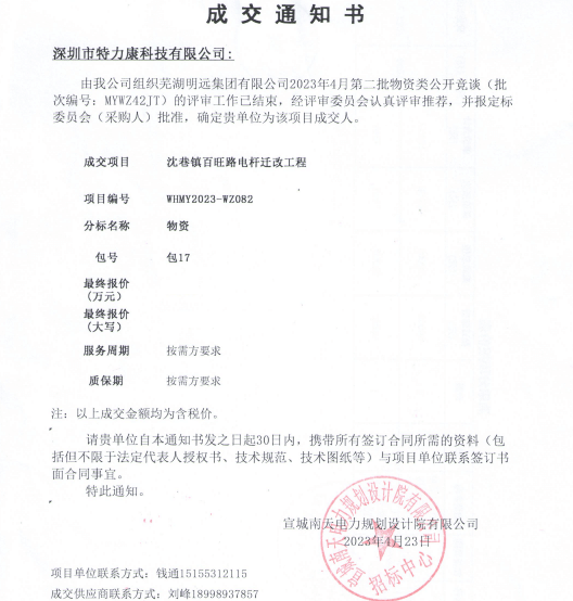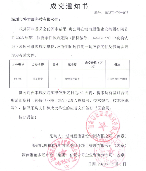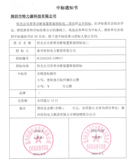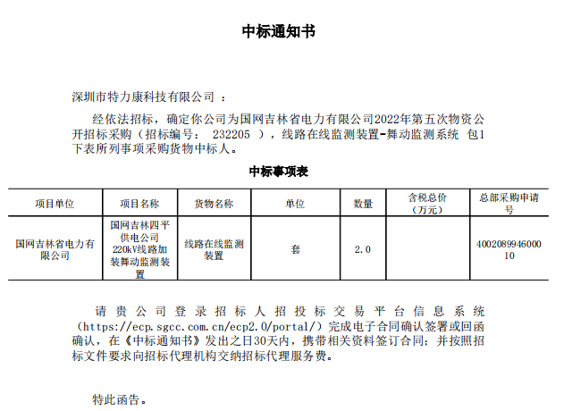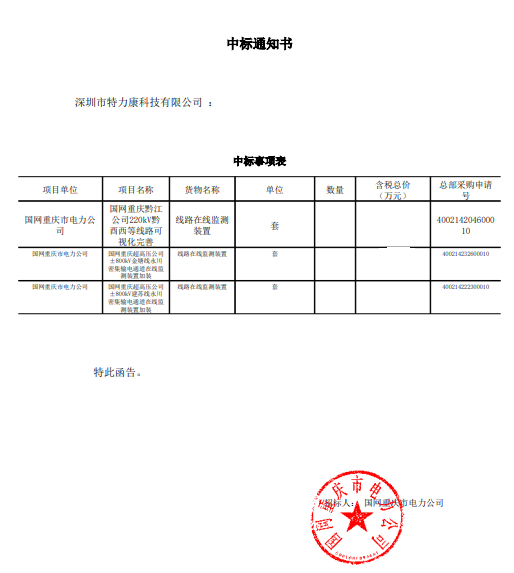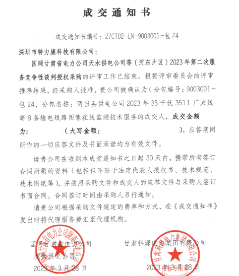特力康中標(biāo)國網(wǎng)黑龍江送變電工程公司的2024年度第18次物資類競爭性談判采購項(xiàng)目——慶陽驅(qū)鳥器物資框 特力康中標(biāo)國網(wǎng)甘肅省電力公司省管產(chǎn)業(yè)單位2024年第五次物資競爭性談判授權(quán)采購項(xiàng)目 中標(biāo)喜訊:深圳市特力康科技有限公司成功入圍許繼集團(tuán)綜合能源公司輸電線路視頻在線監(jiān)測(cè)裝置模塊集采項(xiàng)目 中標(biāo)喜訊:特力康成功中標(biāo)國網(wǎng)重慶市電力公司渝中一片區(qū)項(xiàng)目 特力康成功中標(biāo)國網(wǎng)天津市電力公司2024年第二次?物?資招標(biāo)項(xiàng)目 特力康中標(biāo)國網(wǎng)安徽省電力有限公司蕪湖供電公司2024年3月非物質(zhì)采購項(xiàng)目 浙江電力裝上“氣象哨兵”:特力康裝置守護(hù)電網(wǎng)應(yīng)對(duì)臺(tái)風(fēng)暴雨 蜀道巡線不用“爬”:特力康視頻在線監(jiān)測(cè)裝置守護(hù)四川輸電鐵塔 風(fēng)雪中的 “防冰哨兵”:內(nèi)蒙古電力用特力康監(jiān)測(cè)系統(tǒng)筑牢覆冰防線 雙軸感知護(hù)塔穩(wěn):山西電力用特力康裝置破解采空區(qū)傾斜難題 江西電力裝上 “智能防鳥衛(wèi)士”—— 特力康綜合激光驅(qū)鳥器破解湖區(qū)變電站鳥害難題 破解巡檢難題:貴州電力用特力康 AI 微拍裝置,精準(zhǔn)捕捉線路隱性隱患 精準(zhǔn)捕捉 “微氣象”:浙江電力用特力康預(yù)警系統(tǒng)筑牢電網(wǎng)氣候防線 守護(hù) “電力咽喉”:湖南電力投用百套特力康三跨 4G 監(jiān)控球,筑牢安全防線 貴州電力裝特力康電網(wǎng)架空線路覆冰監(jiān)測(cè)系統(tǒng),精準(zhǔn)防冰保電網(wǎng)過冬? 寧夏配電線路安裝了我司防外破電子化智能警示牌