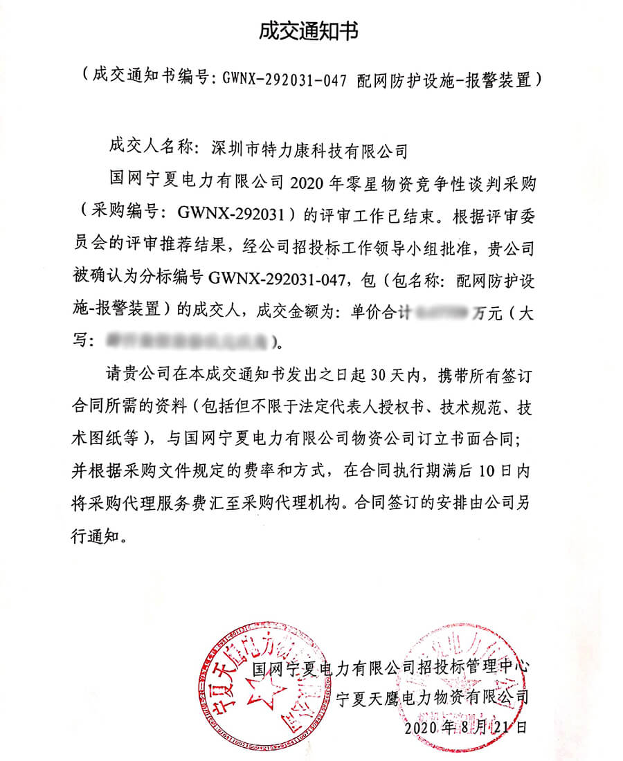 特力康中標(biāo)國(guó)網(wǎng)黑龍江送變電工程公司的2024年度第18次物資類競(jìng)爭(zhēng)性談判采購(gòu)項(xiàng)目——慶陽(yáng)驅(qū)鳥器物資框 特力康中標(biāo)國(guó)網(wǎng)甘肅省電力公司省管產(chǎn)業(yè)單位2024年第五次物資競(jìng)爭(zhēng)性談判授權(quán)采購(gòu)項(xiàng)目 中標(biāo)喜訊:深圳市特力康科技有限公司成功入圍許繼集團(tuán)綜合能源公司輸電線路視頻在線監(jiān)測(cè)裝置模塊集采項(xiàng)目 中標(biāo)喜訊:特力康成功中標(biāo)國(guó)網(wǎng)重慶市電力公司渝中一片區(qū)項(xiàng)目 特力康成功中標(biāo)國(guó)網(wǎng)天津市電力公司2024年第二次?物?資招標(biāo)項(xiàng)目 特力康中標(biāo)國(guó)網(wǎng)安徽省電力有限公司蕪湖供電公司2024年3月非物質(zhì)采購(gòu)項(xiàng)目 浙江電力裝上“氣象哨兵”:特力康裝置守護(hù)電網(wǎng)應(yīng)對(duì)臺(tái)風(fēng)暴雨 蜀道巡線不用“爬”:特力康視頻在線監(jiān)測(cè)裝置守護(hù)四川輸電鐵塔 風(fēng)雪中的 “防冰哨兵”:內(nèi)蒙古電力用特力康監(jiān)測(cè)系統(tǒng)筑牢覆冰防線 雙軸感知護(hù)塔穩(wěn):山西電力用特力康裝置破解采空區(qū)傾斜難題 江西電力裝上 “智能防鳥衛(wèi)士”—— 特力康綜合激光驅(qū)鳥器破解湖區(qū)變電站鳥害難題 破解巡檢難題:貴州電力用特力康 AI 微拍裝置,精準(zhǔn)捕捉線路隱性隱患 精準(zhǔn)捕捉 “微氣象”:浙江電力用特力康預(yù)警系統(tǒng)筑牢電網(wǎng)氣候防線 守護(hù) “電力咽喉”:湖南電力投用百套特力康三跨 4G 監(jiān)控球,筑牢安全防線 貴州電力裝特力康電網(wǎng)架空線路覆冰監(jiān)測(cè)系統(tǒng),精準(zhǔn)防冰保電網(wǎng)過冬? 寧夏配電線路安裝了我司防外破電子化智能警示牌