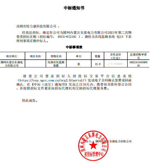 經(jīng)依法招標(biāo),確定我司為國網(wǎng)內(nèi)蒙古東部電力有限公司2023年第二次物資類招標(biāo)采購(招標(biāo)編號: HYCG -072303 ),測控及在線監(jiān)測系統(tǒng)包15下表所列事項(xiàng)采購中標(biāo)人。中標(biāo)通知如下: