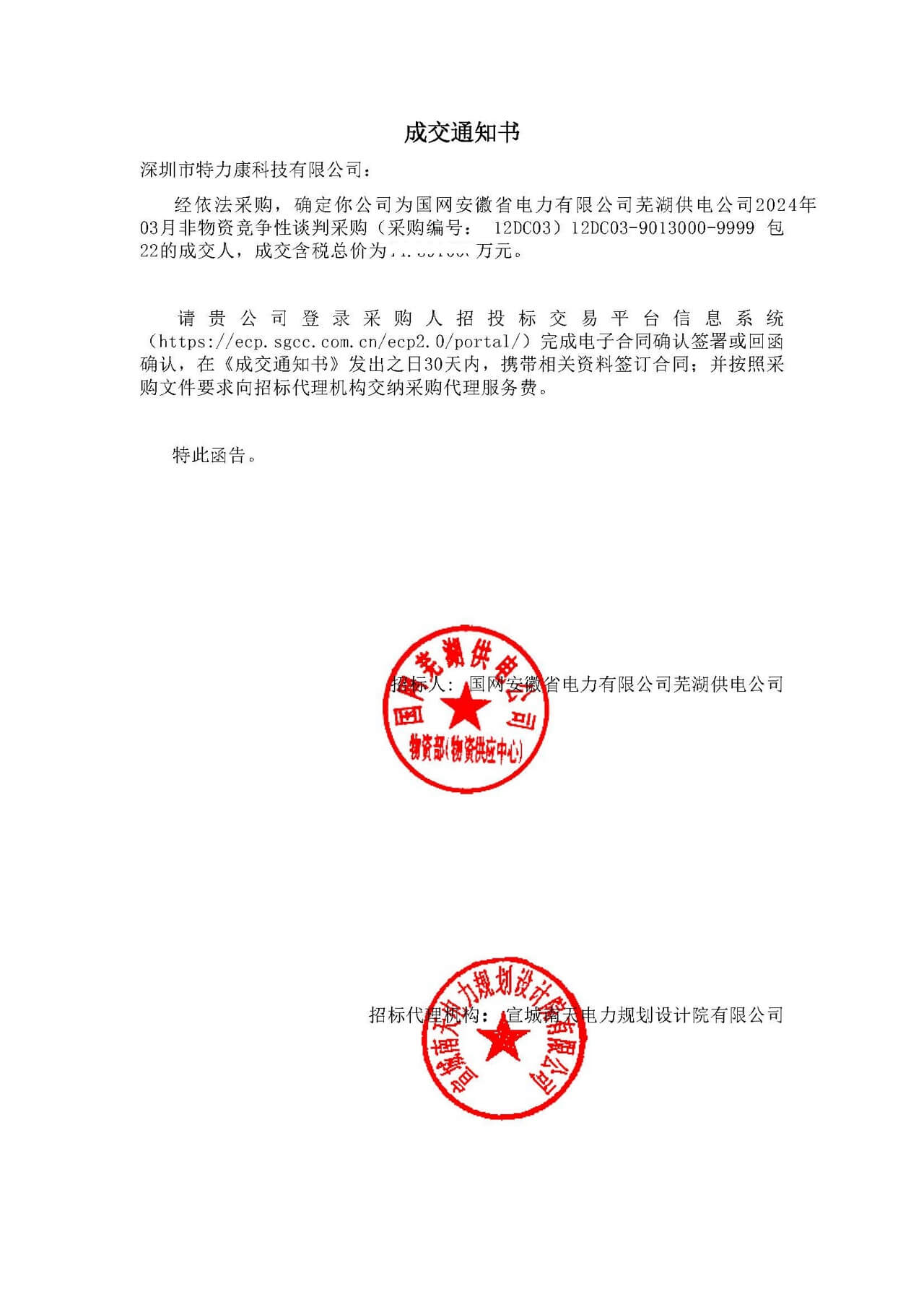 2024年4月1日——深圳市特力康科技有限公司(以下簡稱“特力康”)近日成功中標(biāo)國網(wǎng)安徽省電力有限公司蕪湖供電公司2024年3月非物資競爭性談判采購項目(采購編號:12DCO3)中的相關(guān)包件。