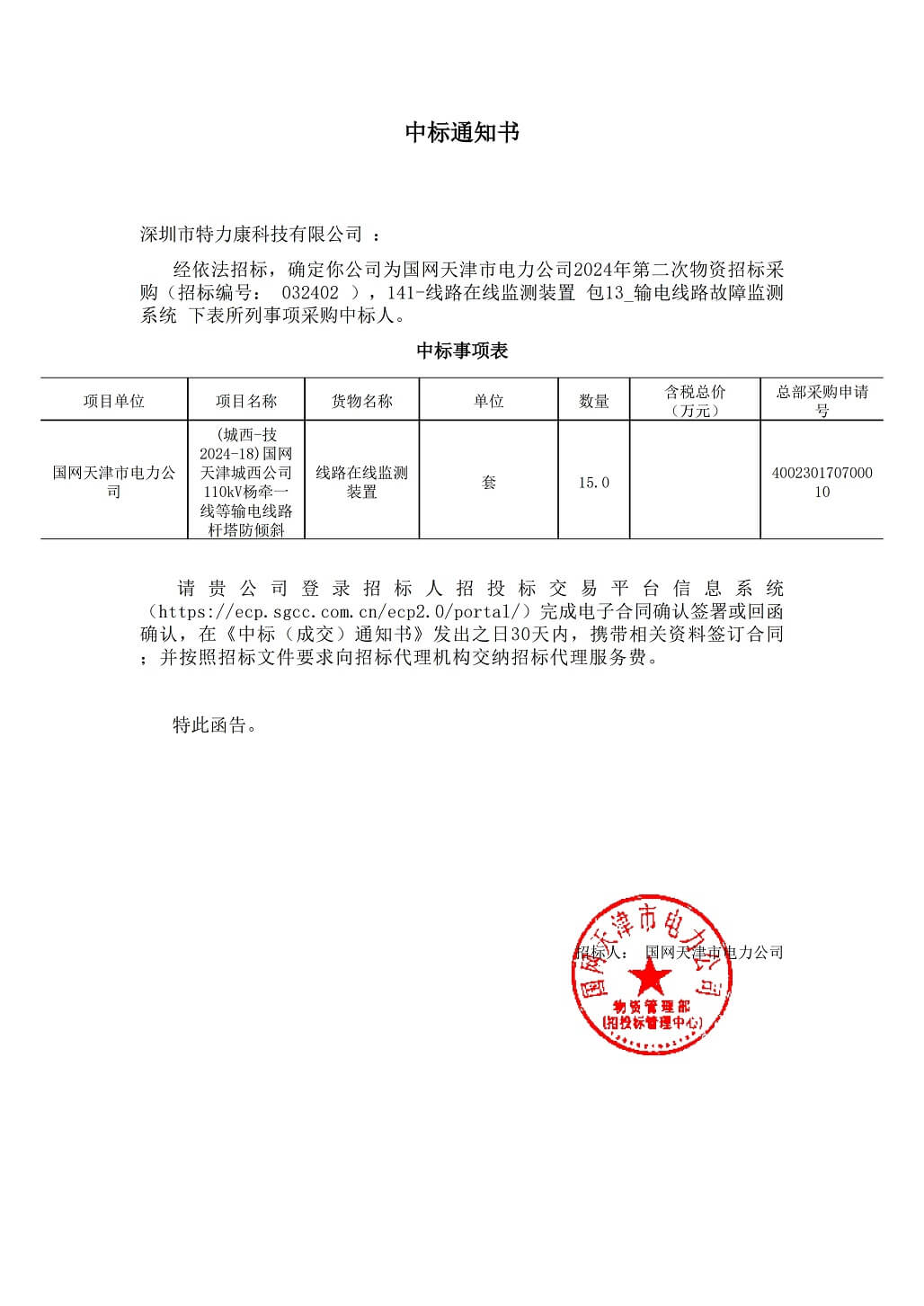 2024年4月18日——深圳市特力康科技有限公司(特力康)宣布,我司已中標國網天津市電力公司2024年第二次物資招標采購項目中的141-線路在線監(jiān)測裝置包13_輸電線路故障監(jiān)測系統(tǒng)。