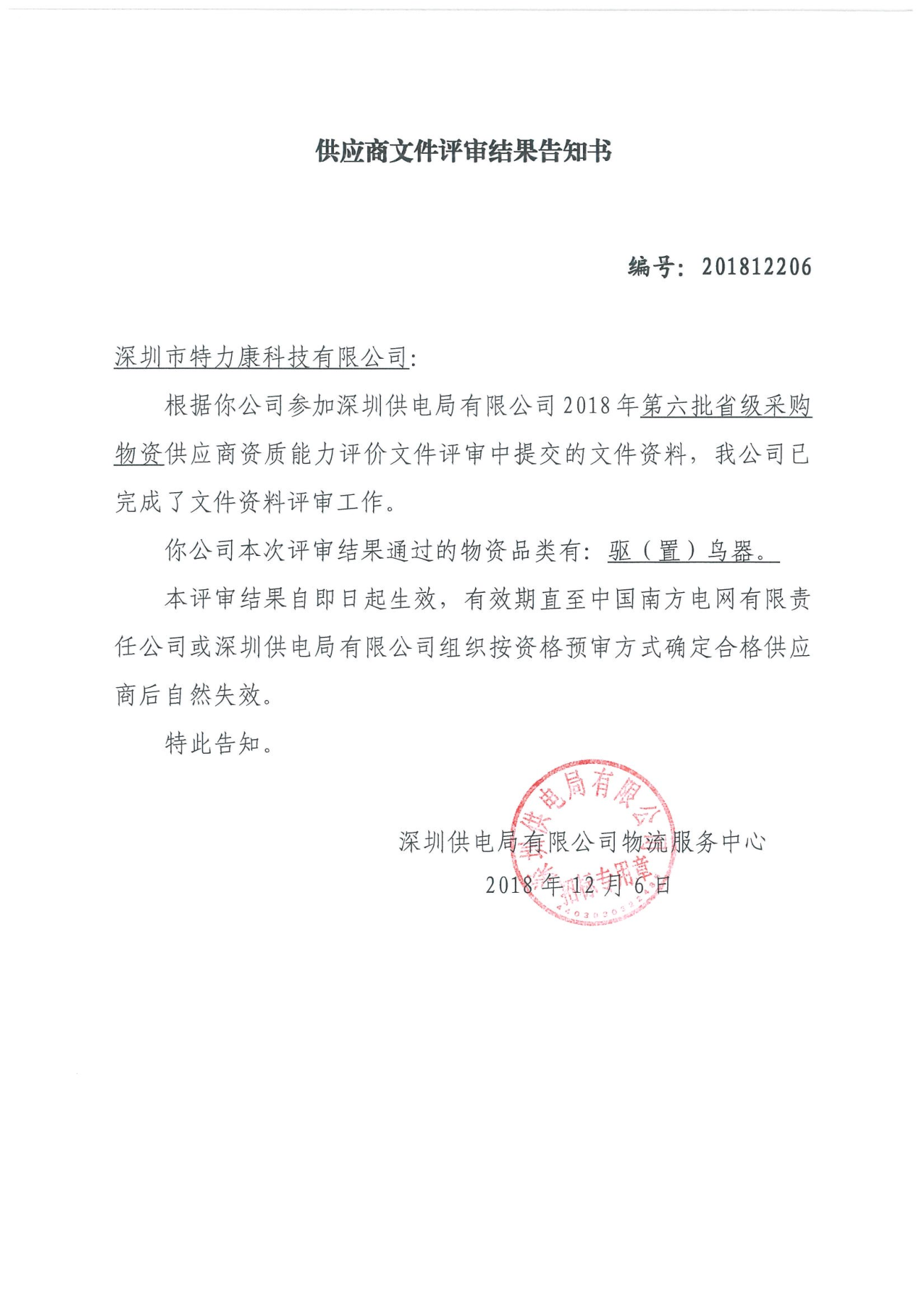 南方電網(wǎng)深圳供電有限公司2018年第六批驅(qū)(置)鳥(niǎo)器框架項(xiàng)目評(píng)審工作已結(jié)束,經(jīng)評(píng)審委員會(huì)評(píng)審,經(jīng)南網(wǎng)深圳電力公司招投標(biāo)領(lǐng)導(dǎo)小組批準(zhǔn),我司被確定為此次驅(qū)(置)鳥(niǎo)器框架中標(biāo)單位現(xiàn)將公告公示。