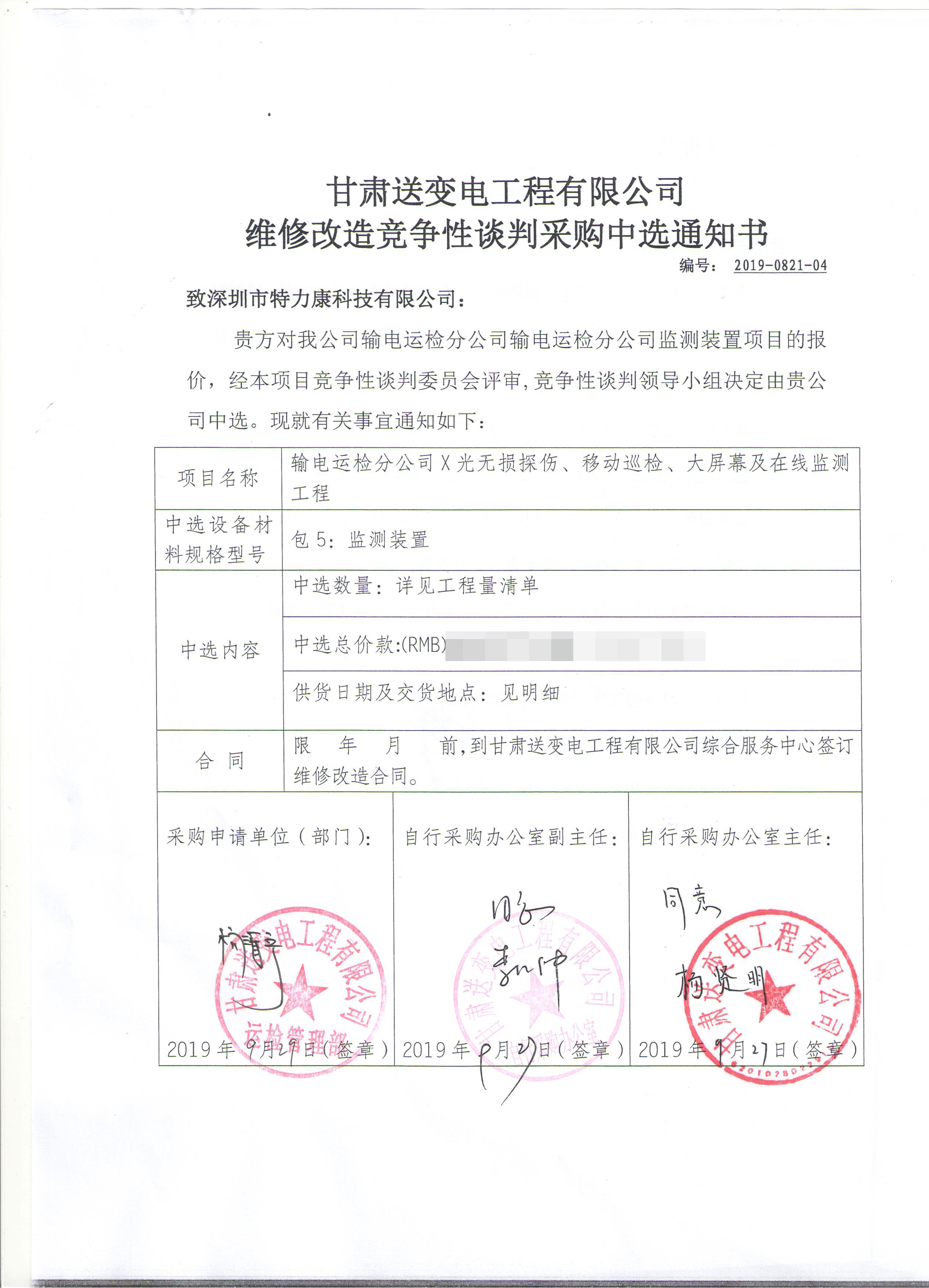 經(jīng)審委員會根據(jù)招標(biāo)程標(biāo)次評審、對有效標(biāo)書認(rèn)真評審,競爭性談判領(lǐng)導(dǎo)小組確定我司為甘肅送變電工程有限公司維修改造競爭性談判采購項(xiàng)目中標(biāo)單位。
