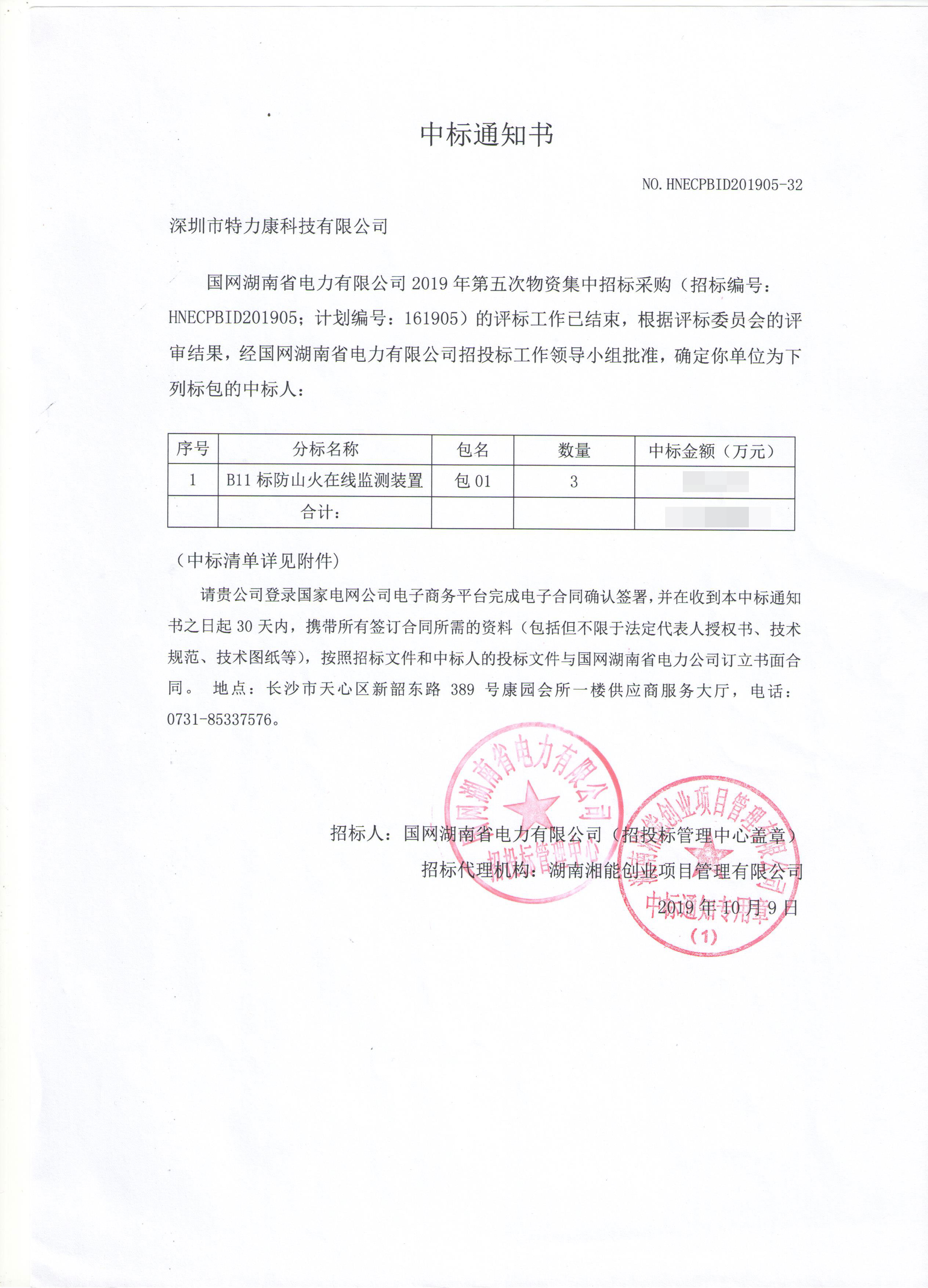 國網(wǎng)湖南省電力有限公司2019年第五次物資集中招標(biāo)輸電線路防山火監(jiān)測裝置的評標(biāo)工作已結(jié)束,根據(jù)評標(biāo)審結(jié)果,經(jīng)國網(wǎng)湖南省電力有限公司招投標(biāo)工作領(lǐng)導(dǎo)小組批準(zhǔn),確定我司深圳市特力康科技有限公司為列標(biāo)包的中標(biāo)人。