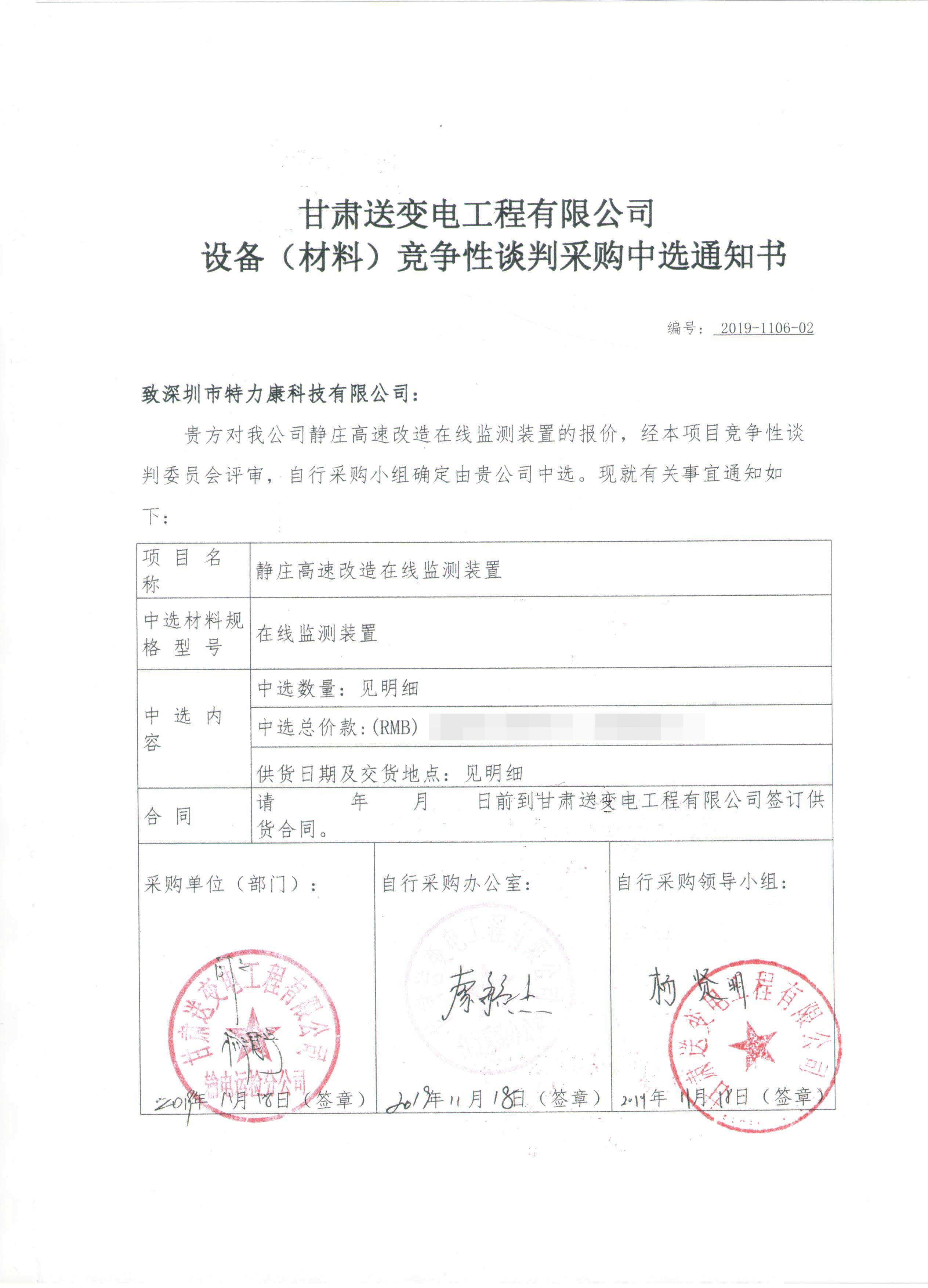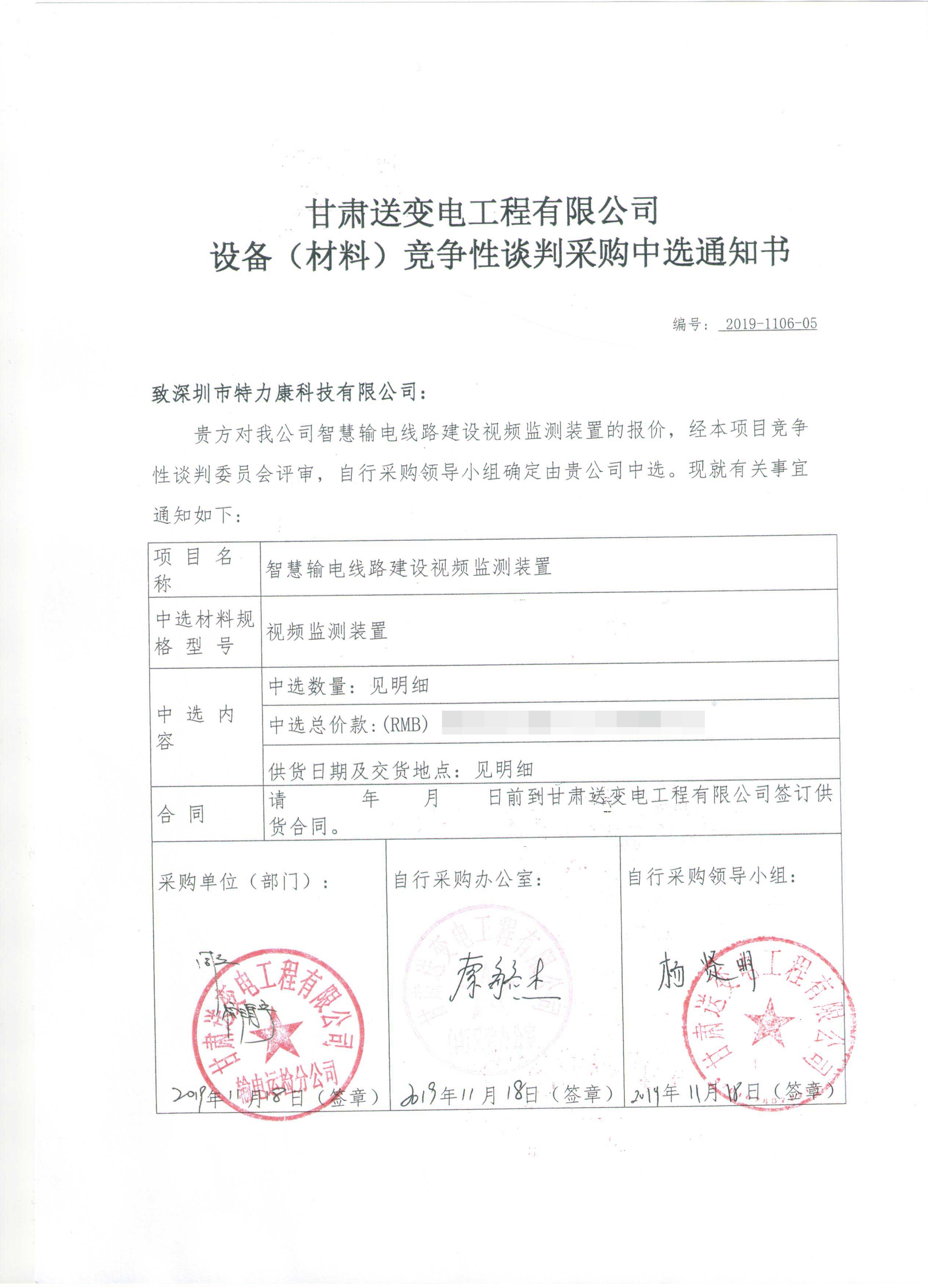 甘肅送變電工程有限公司智慧輸電線路建設(shè)視頻監(jiān)測(cè)裝置及靜莊高速改造在線監(jiān)測(cè)裝置競(jìng)爭(zhēng)性談判采購(gòu)工作已經(jīng)結(jié)束,根據(jù)評(píng)審委員會(huì)評(píng)審結(jié)果,招投標(biāo)領(lǐng)導(dǎo)小組批準(zhǔn),確定此次甘肅送變電工程有限公司智慧輸電線路建設(shè)視頻監(jiān)測(cè)裝置及靜莊高速改造在線監(jiān)測(cè)裝置競(jìng)爭(zhēng)性談判采購(gòu)由我司深圳市特力康科技有限公司中標(biāo),現(xiàn)將公告示下: