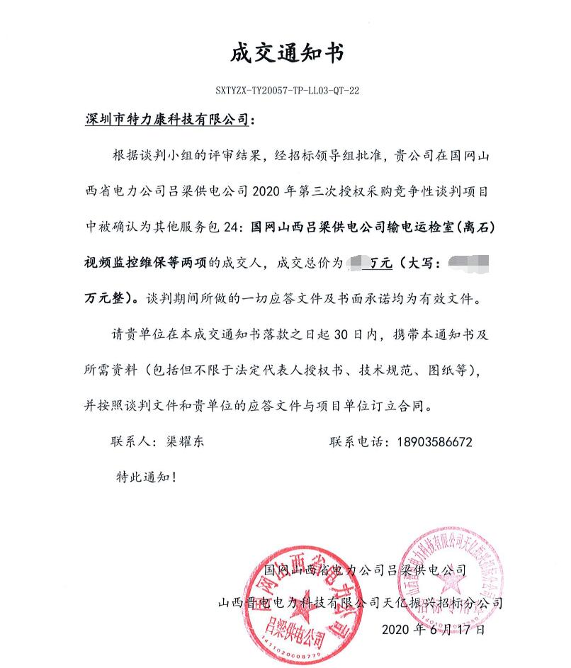 根據(jù)談判小組的評審結果,經(jīng)招標領導組批準,我司(深圳市特力康科技有限公司)在國網(wǎng)山西省電力公司呂梁供電公司2020年第三次授權采購競爭性談判項目中被確認為其他服務包24:國網(wǎng)山西呂梁供電公司輸電運檢室(離石)視頻監(jiān)控維保等兩項的成交人,現(xiàn)中標通知以下:
