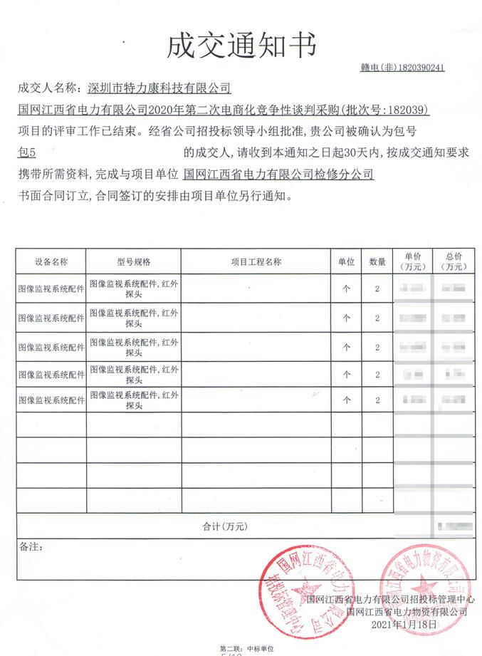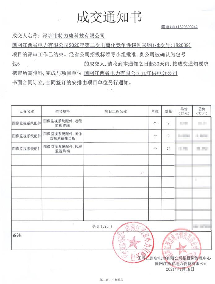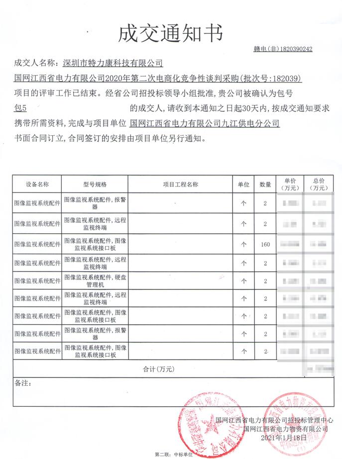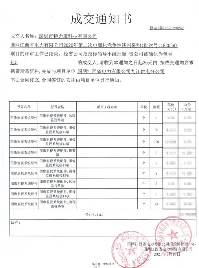 國網(wǎng)江西省電力有限公司2020年第二次電商化競(jìng)爭性談判采購(批次號(hào):182039)項(xiàng)目的評(píng)審工作已結(jié)束。經(jīng)省公司招投標(biāo)領(lǐng)導(dǎo)小組批準(zhǔn),我司(深圳市特力康科技有限公司)被確認(rèn)為包號(hào)包5(圖像監(jiān)視系統(tǒng)配件)的成交人,成交通知如下: