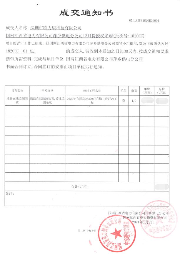 國網(wǎng)江西省電力有限公司萍鄉(xiāng)供電分公司12月份授權(quán)采購(批次號: 1820EC)項(xiàng)目的評審工作已結(jié)束。經(jīng)國網(wǎng)江西省電力有限公司萍鄉(xiāng)供電分公間領(lǐng)導(dǎo)小組批準(zhǔn),我司(深圳市特力康科技有限公司)被確認(rèn)為包1820EC- 101-包1(線路在線監(jiān)測裝置,覆冰監(jiān)測系統(tǒng))的成交人,成交通知如下:
