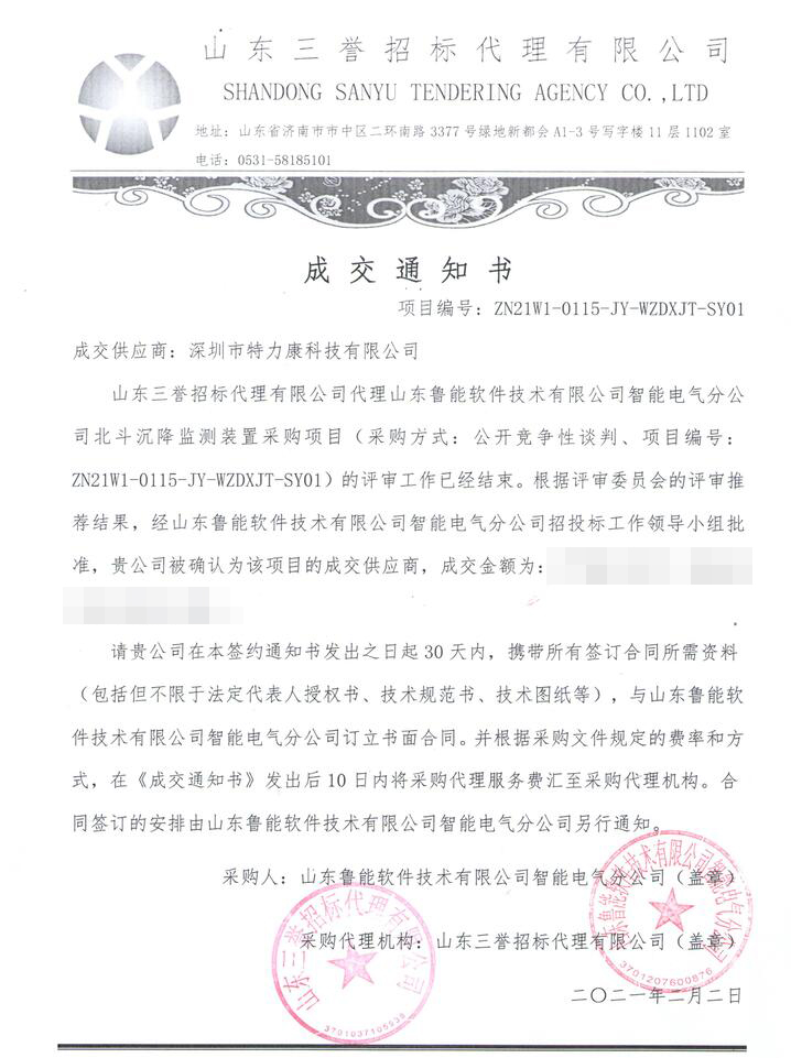 本次山東三譽招標(biāo)代理有限公司代理山東魯能軟件技術(shù)有限公司智能電氣分公司北斗沉降監(jiān)測裝置采購項目(采購方式:公開競爭性談判、項目編號:ZN21W1-0115-JY-WZDXJT-SY01)的評審工作已經(jīng)結(jié)束。根據(jù)評審委員會的評審?fù)扑]結(jié)果,經(jīng)山東魯能軟件技術(shù)有限公司智能電氣分公司招投標(biāo)工作領(lǐng)導(dǎo)小組批準,我司(深圳市特力康科技有限公司)被確認為該項目的成交供應(yīng)商,成交通知如下: