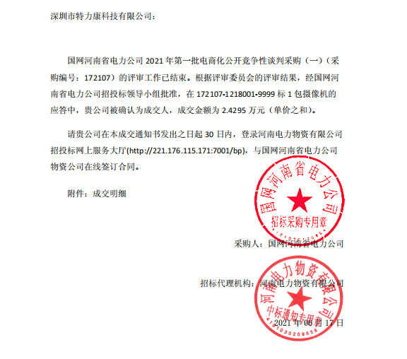 國網(wǎng)河南省電力公司2021年第一批電商化公開競爭性談判采購《- -) (果購編號: 172107) 的評審工作已結(jié)束。根據(jù)評審委員合的評審結(jié)果,經(jīng)國網(wǎng)河南省電力公司招投標領(lǐng)導小組批準,在7210710101.9999標1包攝像機的應答中,責公司被確認為成交人,中標通知如下: