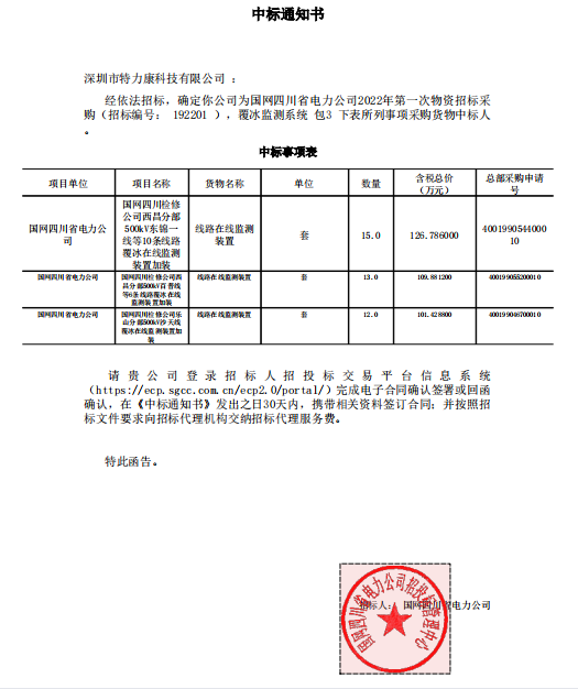 深圳市特力康科技有限公司:經(jīng)依法招標(biāo),確定你公司為國(guó)網(wǎng)四川省電力公司2022年第一次物資招標(biāo)采購(gòu)(招標(biāo)編號(hào): 192201 ),覆冰監(jiān)測(cè)系統(tǒng)包3下表所列事項(xiàng)采購(gòu)貨物中標(biāo)人,中標(biāo)通知如下:
