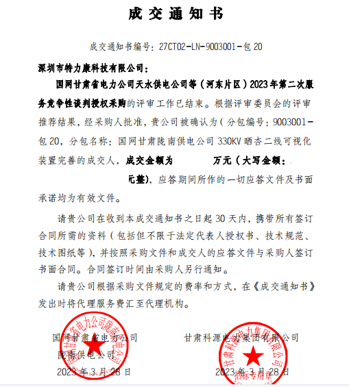 國(guó)網(wǎng)甘肅省電力公司天水供電公司等(河?xùn)|片區(qū)) 2023年第二次服務(wù)競(jìng)爭(zhēng)性談判授權(quán)采購(gòu)的評(píng)審工作已結(jié)束。根據(jù)評(píng)審委員會(huì)的評(píng)審?fù)扑]結(jié)果,經(jīng)采購(gòu)人批準(zhǔn),我司被確認(rèn)為(分包編號(hào): 9003001-包20,分包名稱:國(guó)網(wǎng)甘肅隴南供電公司330KV曬杏二線可視化裝置完善的成交人,成交通知書如下: